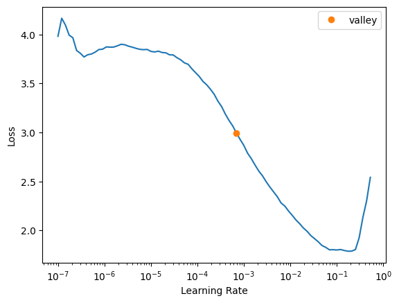 learn.lr_find()SuggestedLRs(valley=0.0006918309954926372)