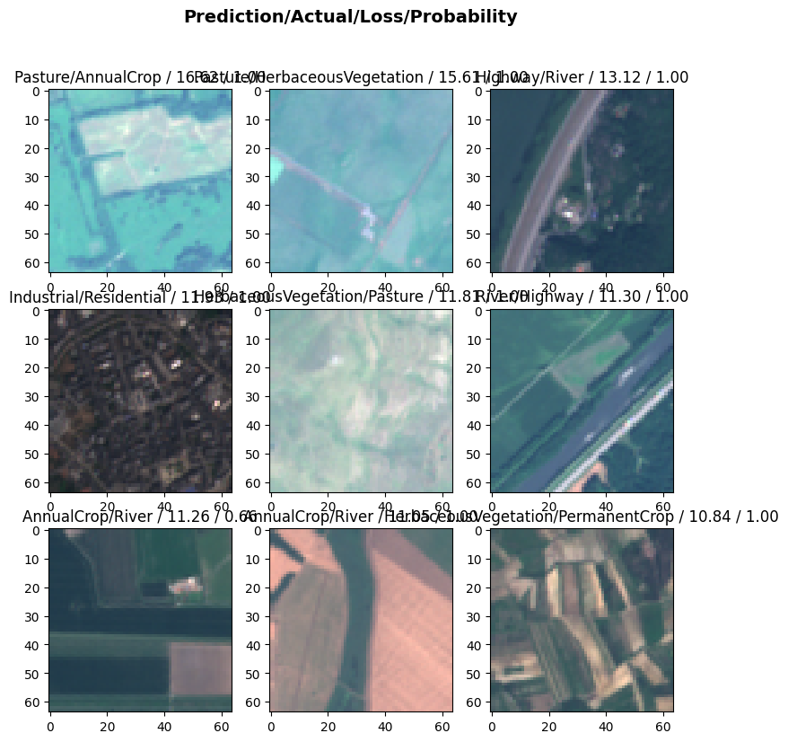 import numpy as nplearn.fine_tune(10, freeze_epochs=3,base_lr=7e-4, cbs=[SaveModelCallback(monitor='accuracy',fname='euronet-resnet50-stage1')])| epoch | train_loss | valid_loss | accuracy | time |